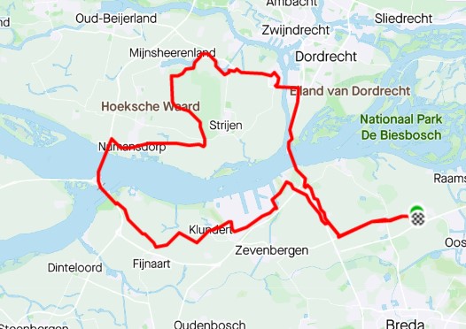 Wat een zomer, echte zomerse dagen hebben we nog niet gehad. Bij de planning kijken we altijd naar het weerbericht, de voorspelling was NNW wind en mogelijk hier en daar een bui. Met dit in het achterhoofd stond ik vanmorgen op. Rondje Binnenmaas was dus de planning. Ik twijfel of ik armstukken aan doe als ik voor de kledingkast sta. Het is 17 °C, dus boven de 15 °C bij de Jonge Renner geldt dan kort – kort. Dus de mouwen en de broek. Leo staat al in de starthouding als ik op het Ruiterspoor kom. We rijden via de Hespelaar naar de May, de rotonde bij de Bromtol is nog niet klaar, je moet daar nog gravelen. Op het plein staan al verschillende renners en rensters klaar. Maurice had gisteren na het rondje TMM (Team Munne Maot) nog bij getraind door naar Antwerpen te rijden solo. Tijdens deze tocht kwam hij er achter dat een rondje Binnenmaas wel erg veel zijwind zou geven. En soepel als we zijn, werd terplekke beslist om de Biesbosch te rijden vandaag. Ik stel voor om via Blauwe Sluis te vertrekken.